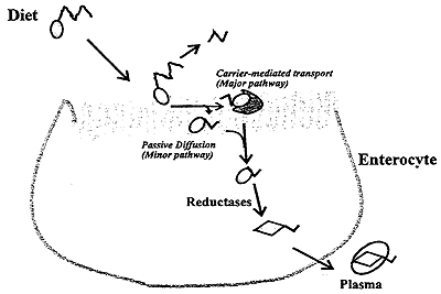 >Conversion to a transport form to cross membrane from the enterocyte into the plasma.