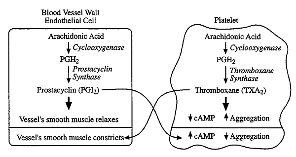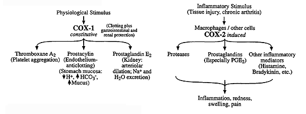 Cyclooxygenase (COX) exists as two isozymes, COX-1 and COX-2. The current hypothesis is that the therapeutic effects of drugs such as aspirin and Vioxx are due to the inhibition of COX-2 whereas the unwanted side-effects, such as the action on platelets, arise from inhibition of COX-1.